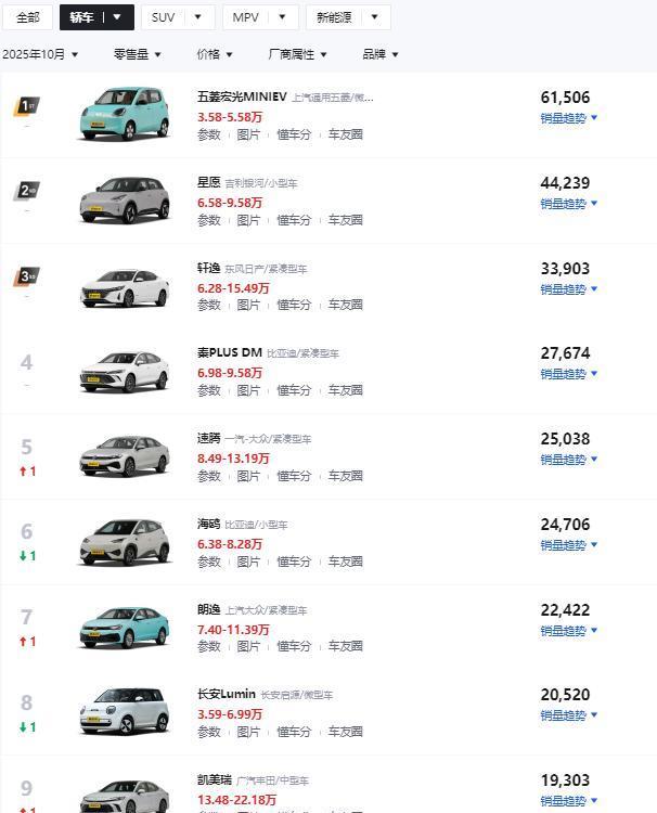 综合观察10月的轿车市场,新能源车进一步占据主导地位,不仅包揽销量榜冠亚军,在前十席位中也占据了五席。其次,市场的消费分层现象明显,以宏光MINIEV、比亚迪海鸥和长安Lumin为代表的经济型代步车构成了市场的基本盘,同时燃油车阵营目前同样保持着韧性。此外,自主品牌的崛起已成定局,在销量前十的车型中,自主品牌占据了绝大多数席位,而合资品牌则仅依靠少数经典燃油车型苦苦支撑。