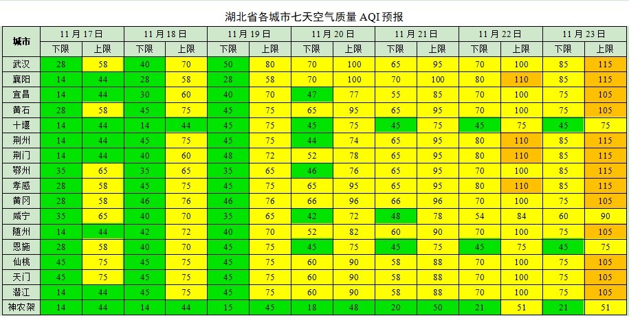 11月20日至23日,全省晴到多云,偏北风转偏东风2到3级。白天大部地区边界层高度1200米以上,大气扩散条件较好。夜间边界层高度降至100~500米,且存在逆温,大气扩散条件一般。其中22-23日中北部大气扩散条件偏差。预计20-22日全省空气质量以良为主,22日早晚时段襄荆荆、孝感有短时轻度污染风险;23日,襄荆荆、孝感、武汉、鄂州有轻度污染风险。首要污染物为PM2.5。