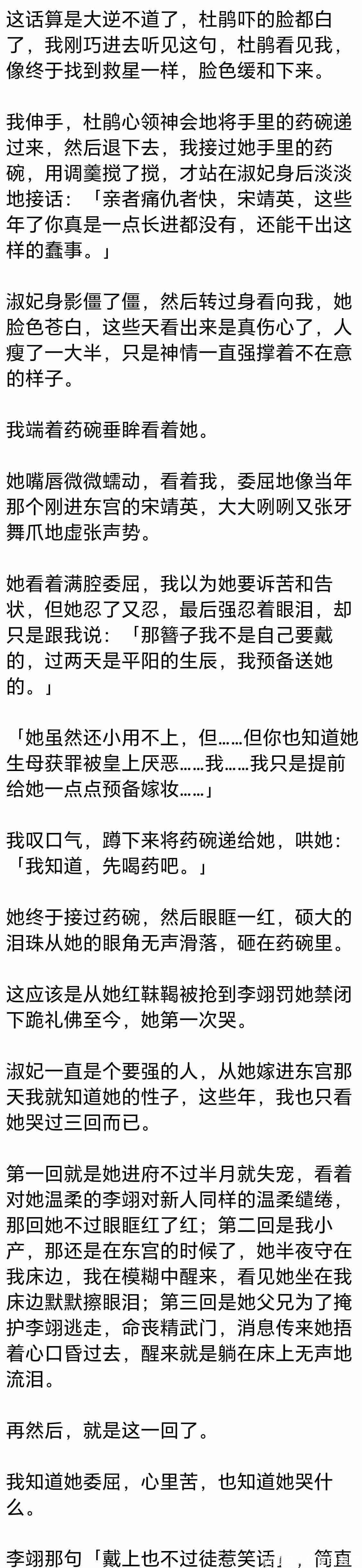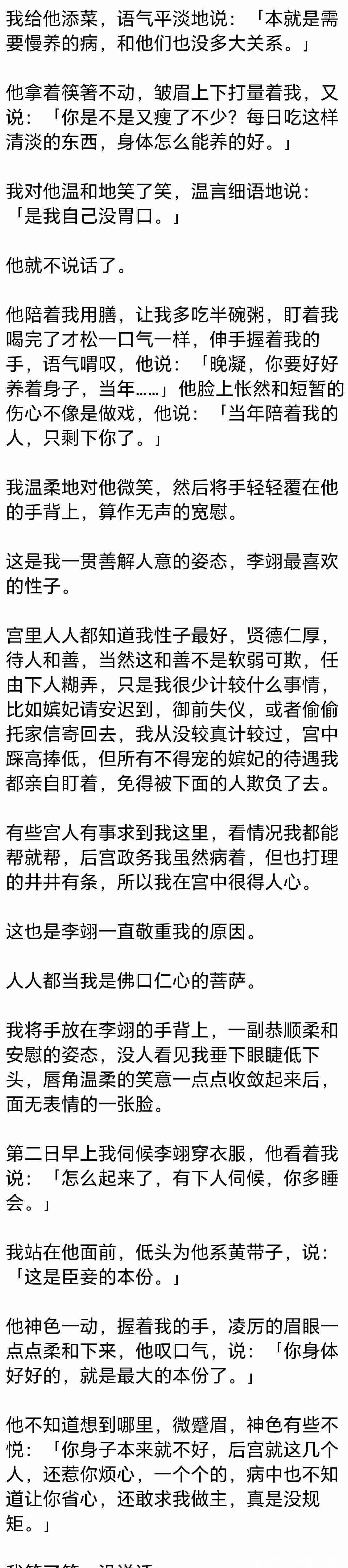 皇后之能淡然处之,首先源于她的身份不可动摇。作为发妻,她拥有“正统”地位,这是先皇选定、祖制保障的根基。 比地位更重要的,是她的心理优势。 她深知皇上的情感地图:敬重发妻、怀念白月光李今纾、对宸妃爱恨交织。 这种洞察让她明白,皇上的专宠往往是一种情绪投射,而非真情实感。