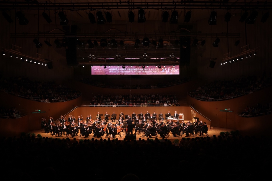 《蓝色多瑙河》圆舞曲的旋律回荡在上海东方艺术中心,这是维也纳爱乐乐团首次在沪奏响这首奥地利民间的“第二国歌”。一曲奏毕,全场响起雷鸣般的掌声。11月22日晚,随着指挥大师克里斯蒂安·蒂勒曼手中指挥棒的起落,金色之声如约响起,开启连续两晚的纯正德奥古典乐盛宴。这是这支顶尖名团20年来第九次亮相上海,也是乐团2024年与东艺签署新一轮战略合作后的首次亮相。