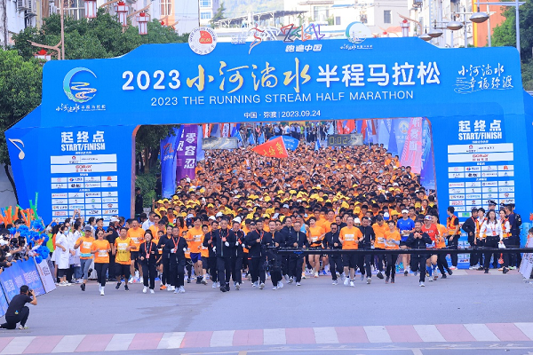 9月24日上午8点,大理弥渡县首届马拉松——2023小河淌水半程马拉松在弥渡花灯广场顺利举办,随着一声枪鸣,激烈热情的马拉松比赛拉开帷幕,来自各地的5000多位跑者们在绚丽的彩烟里冲出拱门,开启了他们的赛事之旅。