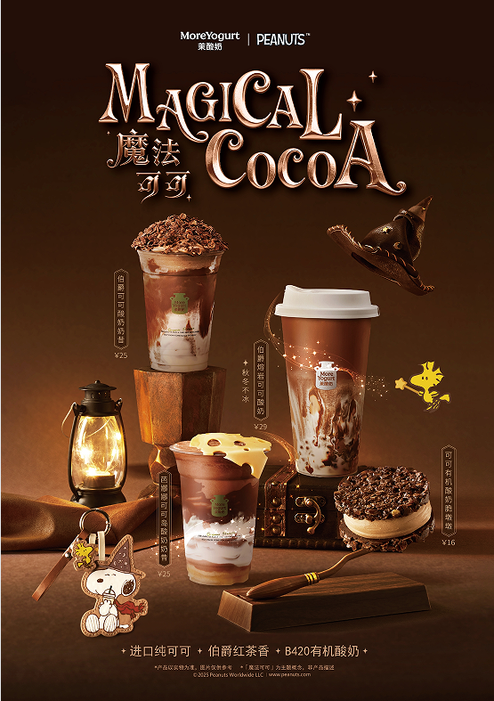 在产品层面,茉酸奶围绕联名主题推出芭娜娜可可岛酸奶奶昔、伯爵可可酸奶奶昔、伯爵熔岩可可酸奶、可可有机酸奶脆墩墩等可可系列特色产品。可可自带的温暖、治愈属性,既契合秋冬氛围,也为“Magical Cocoa”主题提供多元产品支撑。
