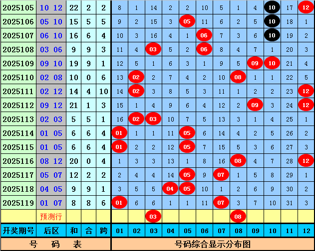 后区分析:上期后区开出号码01和07,最近10期后区奖号奇偶比为11:9,大小比为8:12,本期后区看好号码03、06、07、08、12,后区单挑两码03、08。