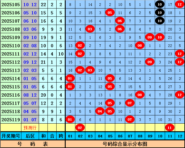 后区上期开出奖号01和07,该组合历史上出现了50次,其下期奖号频次分别为:号码10出现13次,02、09出现10次,07、11、12出现9次,01、08出现8次,04、06出现7次,05出现5次,03出现3次,本期后区参考号码02、09、11、12,精选两码02和11。