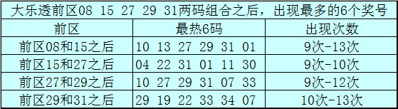 前区两码08和15和之后表现最热的6个号码为:10、13、27、29、31、01;
